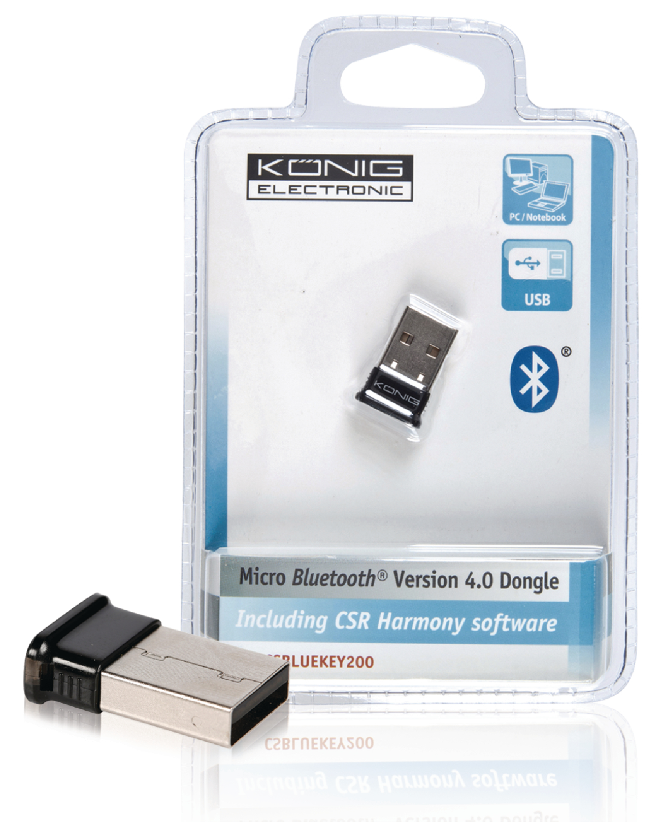 Denne Micro Bluetooth-donglen kobles trådøst fra PC-en til mobile enheter, f.eks. mobiltelefoner, nettbrett og hodetelefoner. Installasjonen gjøres enkelt ved hjelp av Plug and Play. Denne donglen har en rekkevidde på opptil 100 m, støtter Bluetooth-stemmedata og er perfekt å bruke med bærbare datamaskiner takket være den svært kompakte designen og det lave energiforbruket. Den medfølgende CSR Harmony-programvaren er brukervennlig og kan brukes til en rekke funksjoner, blant annet dataopplasting og -nedlasting fra f.eks. smarttelefoner, nettbrett eller bærbare datamaskiner.